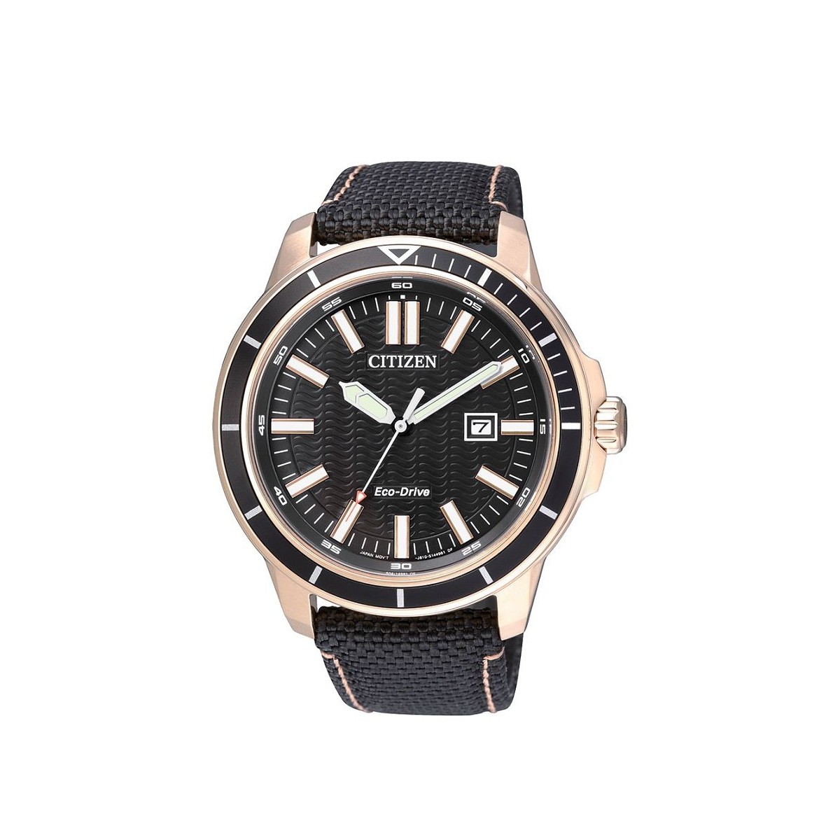 Solar watch mit Movimentosolo Zeit mit Datum, Citizen Eco-Drive Kollektion mit Gold plattiert rostfreien Stahlgehäuse und Armband, schwarzes Zifferblatt und Techniker FR weiße Hände.