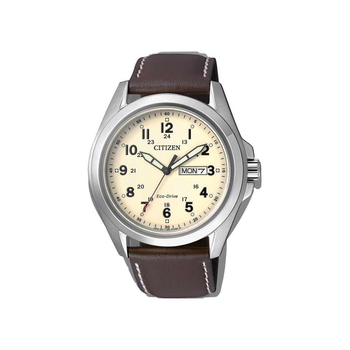 Solar Uhr mit Bewegung nur die Zeit mit Datum wählen Sie Citizen Eco-Drive Kollektion mit Edelstahlgehäuse und Lederarmband braun, und die Hände.