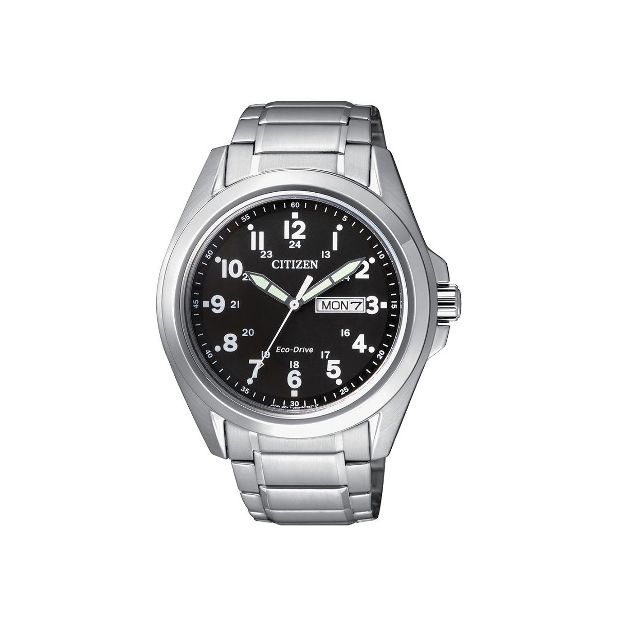 Solar Uhr mit nur Zeit mit Datum Citizen Eco-Drive Kollektion mit Edelstahlgehäuse und Armband, schwarzes Zifferblatt und Zeiger weiß.