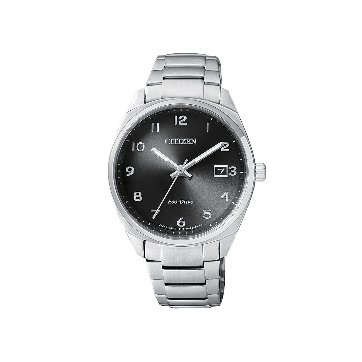 Solar Uhr mit nur Zeit mit Datum Citizen Eco-Drive Kollektion mit Edelstahlgehäuse und Armband, schwarzes Zifferblatt und Zeiger weiß.