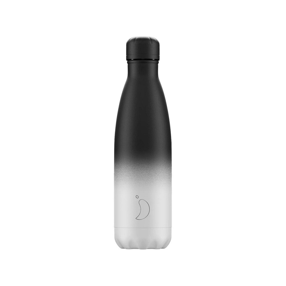 Reusable thermal bottle from the Gradient collection in colors shaded from white on the base to black on the tip and screwable black cap, 500ml capacity, matte finish. The aim of the Chilly's company, founded in 2010 by James Butterfield and Tim Bouscarle, is to create reusable products, to eliminate disposable plastic, but which are attractively designed and with high performance. The bottles are built without BPA, made of resistant 304 stainless steel both inside and outside to preserve the flavor and freshness of your drink. In addition, the advanced double wall vacuum insulation ensures that your drinks remain frozen for up to 24 hours and hot for up to 12 hours, regardless of the outside temperature. The screw-on watertight lid prevents accidental spills and condensation. And finally the single color bottles are now finished using an advanced powder coating process.