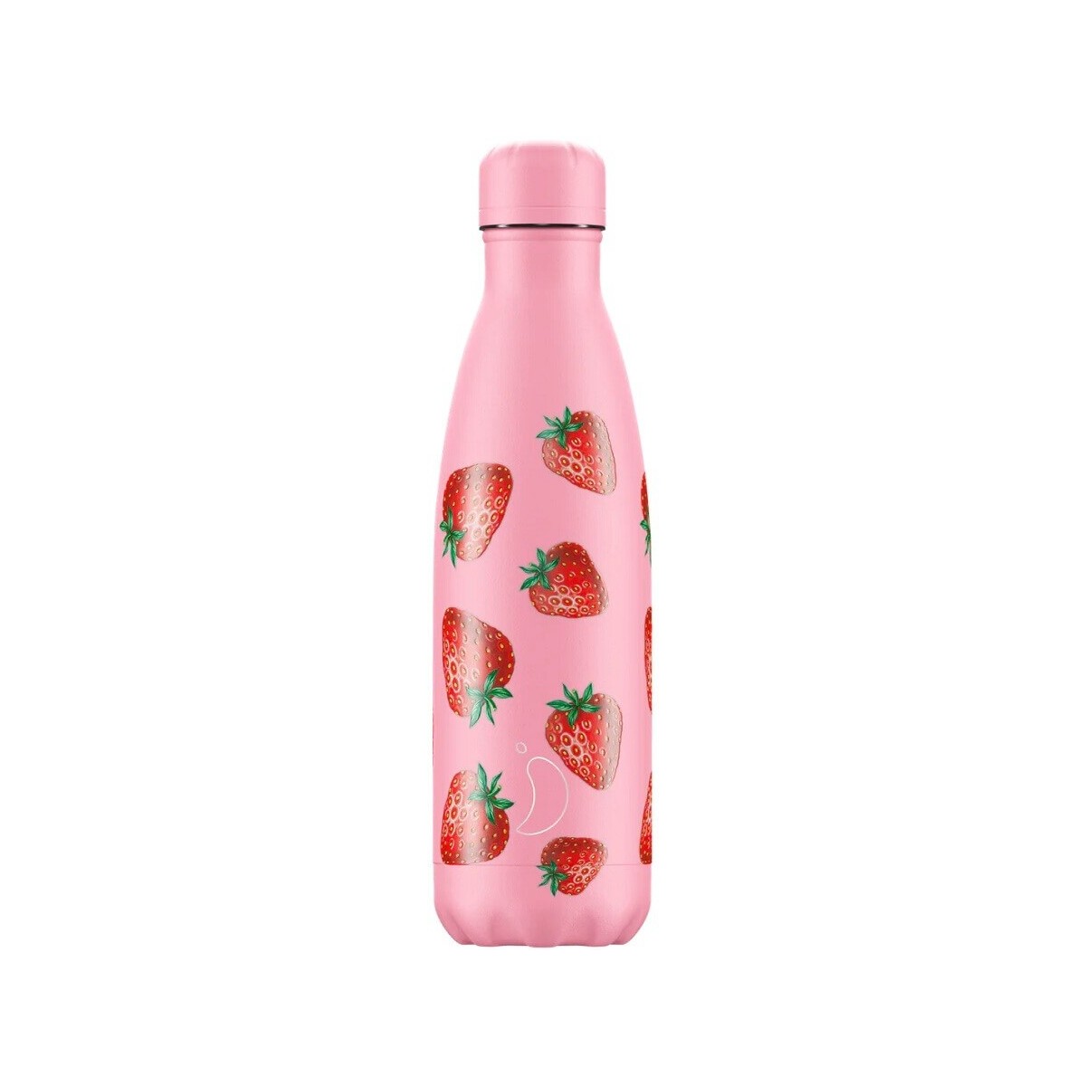 Refillable thermal bottle from the Icons collection in pink with red strawberries and pink screw cap, 500ml capacity, matte finish.