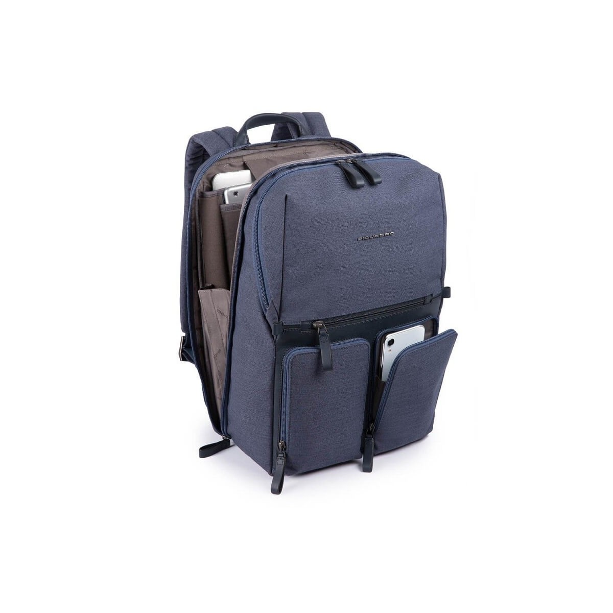 Men's fabric backpack from the Tiros collection in blue with a fast-check pocket for a computer. Tiros is the collection developed with 100% recycled fabric made from plastic and is an informal style collection with details in full-grain calfskin, with a slightly garnet and cloudy appearance, and metallic accessories in matte gunmetal.