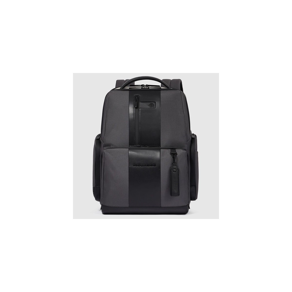 Backpack designed by Piquadro from the Brief 2 unisex collection, 15.6" PC holder with CONNEQU predisposition, bottle/umbrella holder pocket, in gray technical fabric and black leather, with sternum strap, anti-shock and anti-fraud RFID protections and pocket brings Airpods.