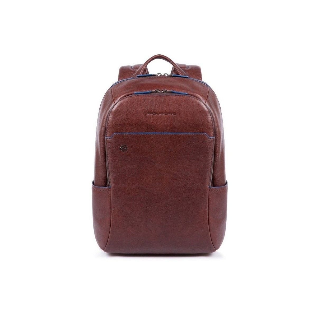 Laptop / iPad backpack in dark brown matte leather with the classic and recognizable hand-painted blue profile. The Blue Square Collection is made of calf leather with mineral tanning to maintain the beauty of the skin over time; the sharp cut edges are hand-painted in light blue and are a highly recognizable distinctive feature.