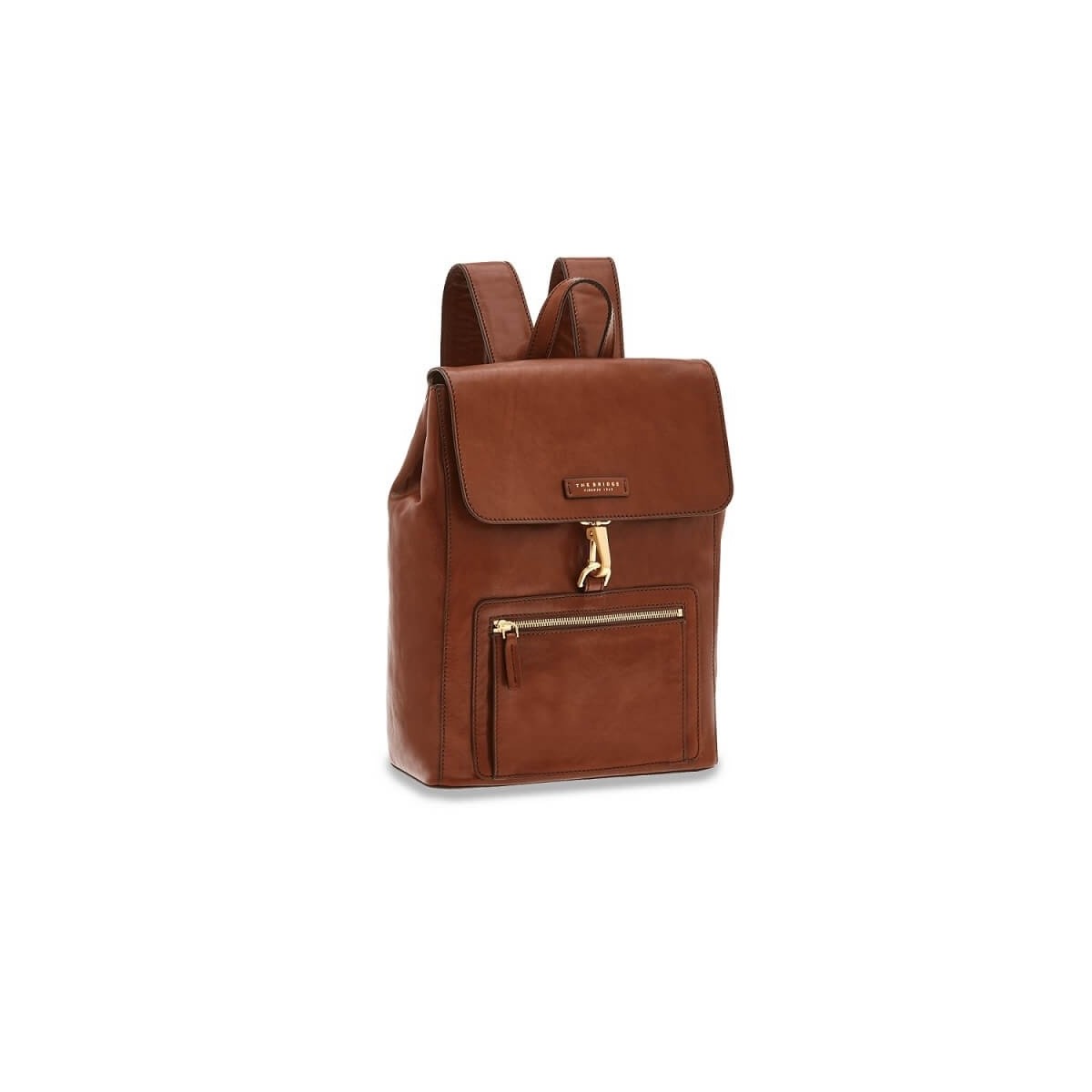 The Bridge women's backpack, from the Alberto collection, made of genuine tan leather with front pocket with zip closure, adjustable shoulder straps and flap closure with gold-plated hook. Fixed internal organization with glasses holder, mobile phone holder, object holder and computer pocket.