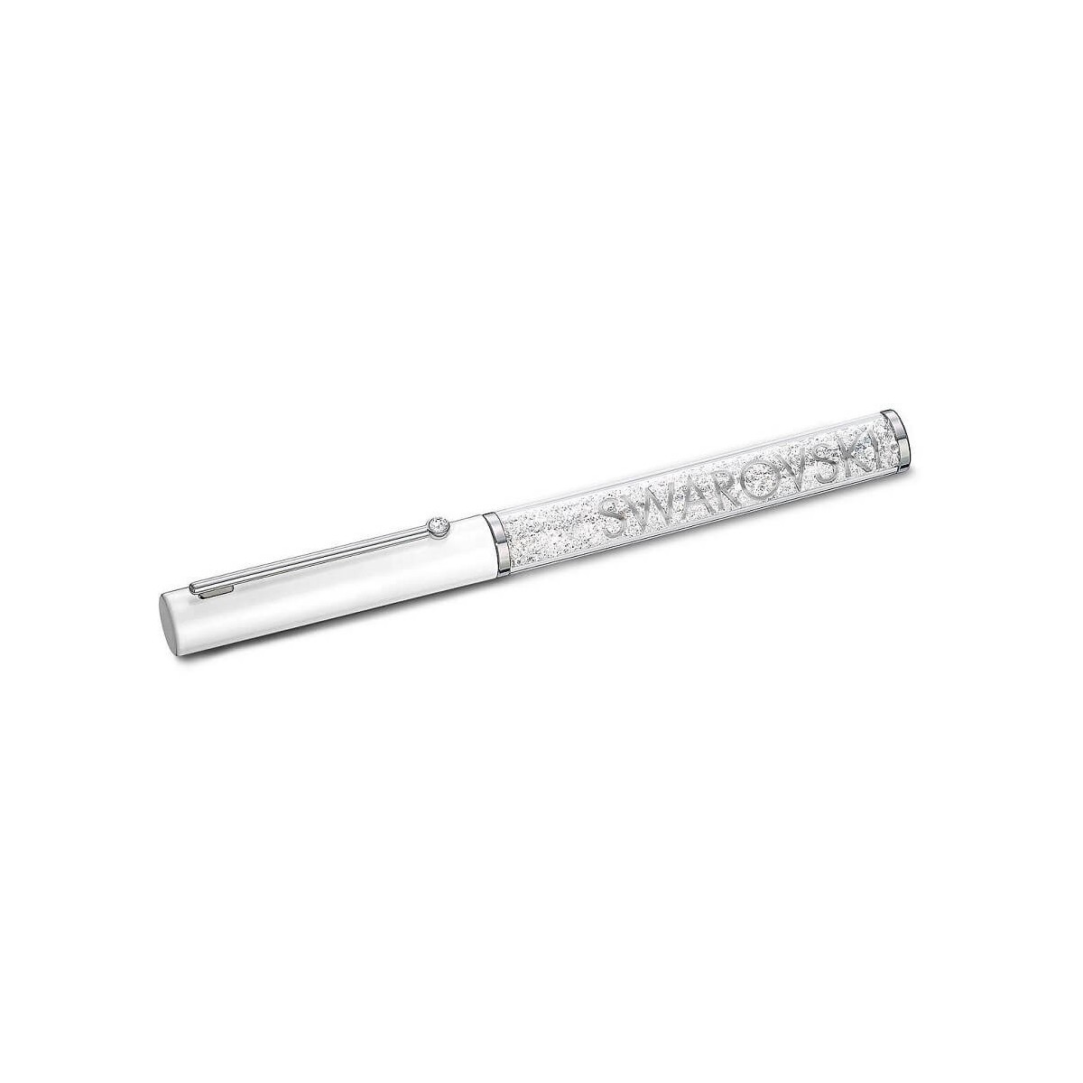 Swarovski ballpoint pen, from the Crystalline Gloss collection, in metal with shiny white plated removable cap with chrome and Crystal Clear clasp. The barrel of the pen is embellished with hundreds of white crystals that give the pen an elegant and sparkling style, ideal for adding style to your office or as a gift.