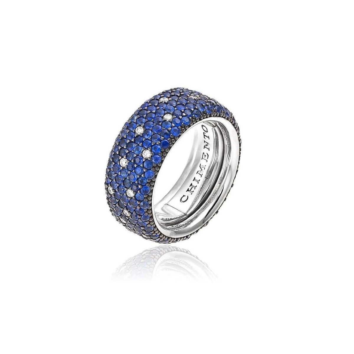 Medium band Chimento women's ring from the Forever Star collection, made in polished 18 kt (750/1000) white gold with natural blue sapphires pavé and brilliant-cut natural diamonds polka dots set in a programmed disorder that is very nice to see.