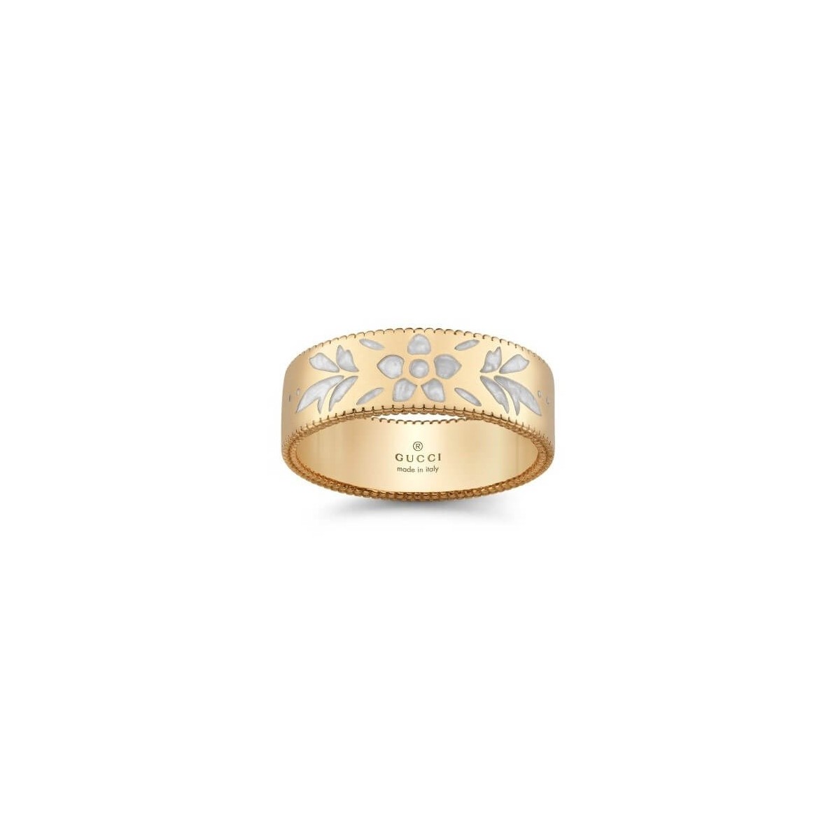 The iconic monogram with the two intertwined Gs, inspired by the initials of the founder of the company Guccio Gucci, was introduced as an ornamental motif in a reissue of the original diamond-shaped print, so this band ring, 6 mm wide in 18 rose gold kt, from the Icon Blooms collection also features a white enamel floral decoration in addition to the monogram. Measure 17.