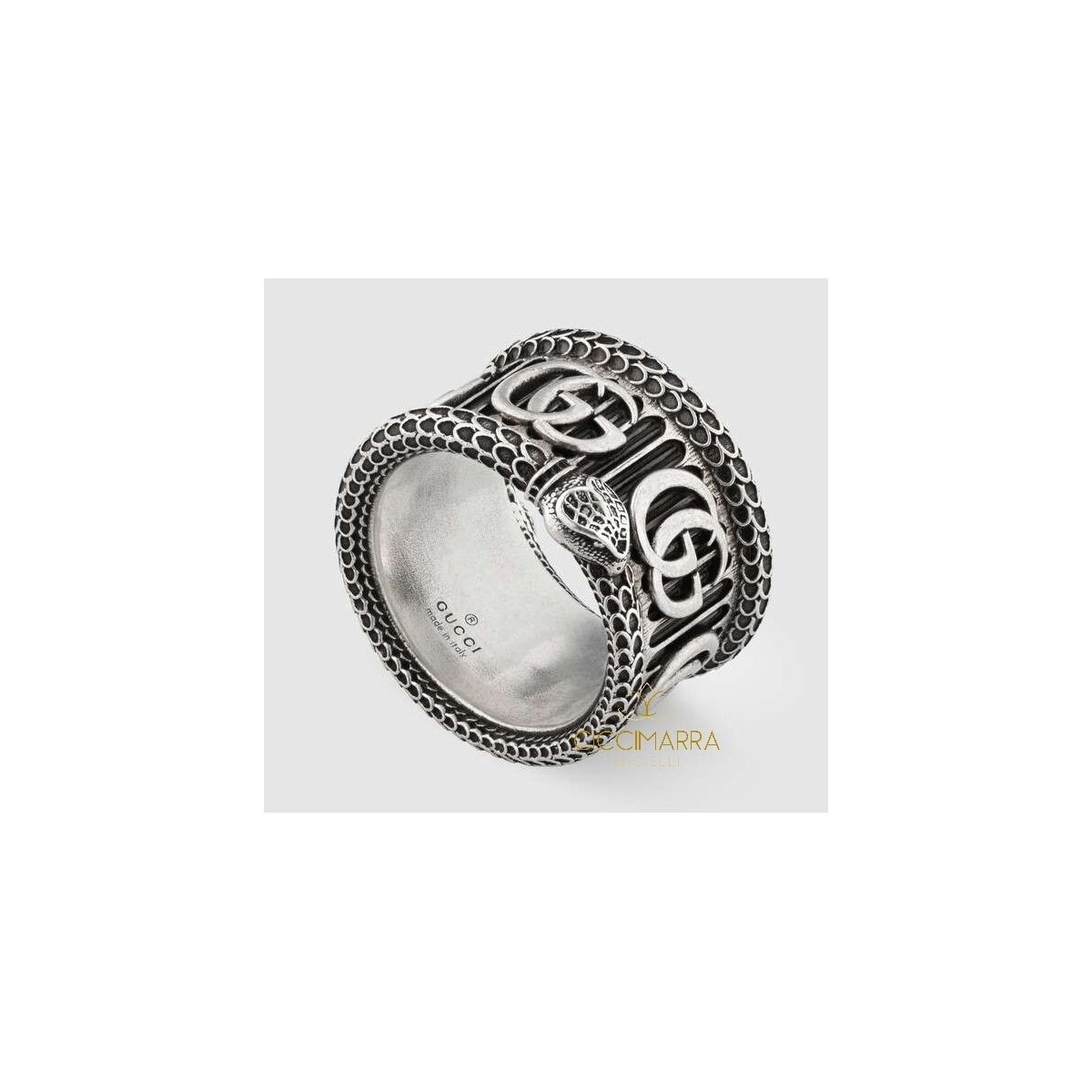 Unisex ring from the Garden collection in antiqued silver band with GG logo that defines this ring. The snake-shaped profiles are enriched with engravings that recreate the reptile scales.
