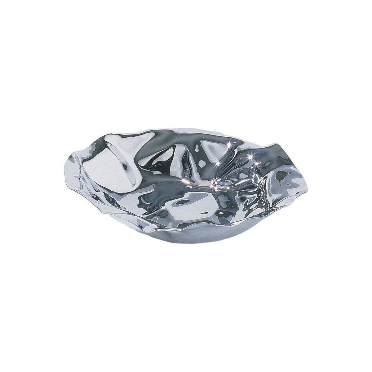 Clotet, who is especially active in architecture but who has also made a number of interesting designs of objects, was fascinated by the playful crumpling of a tray in silver paper and reproduced the effect in a successful mini-series of trays and baskets, in which the crumpled edge is achieved using a complex technique of cold-pressing in a single operation.
