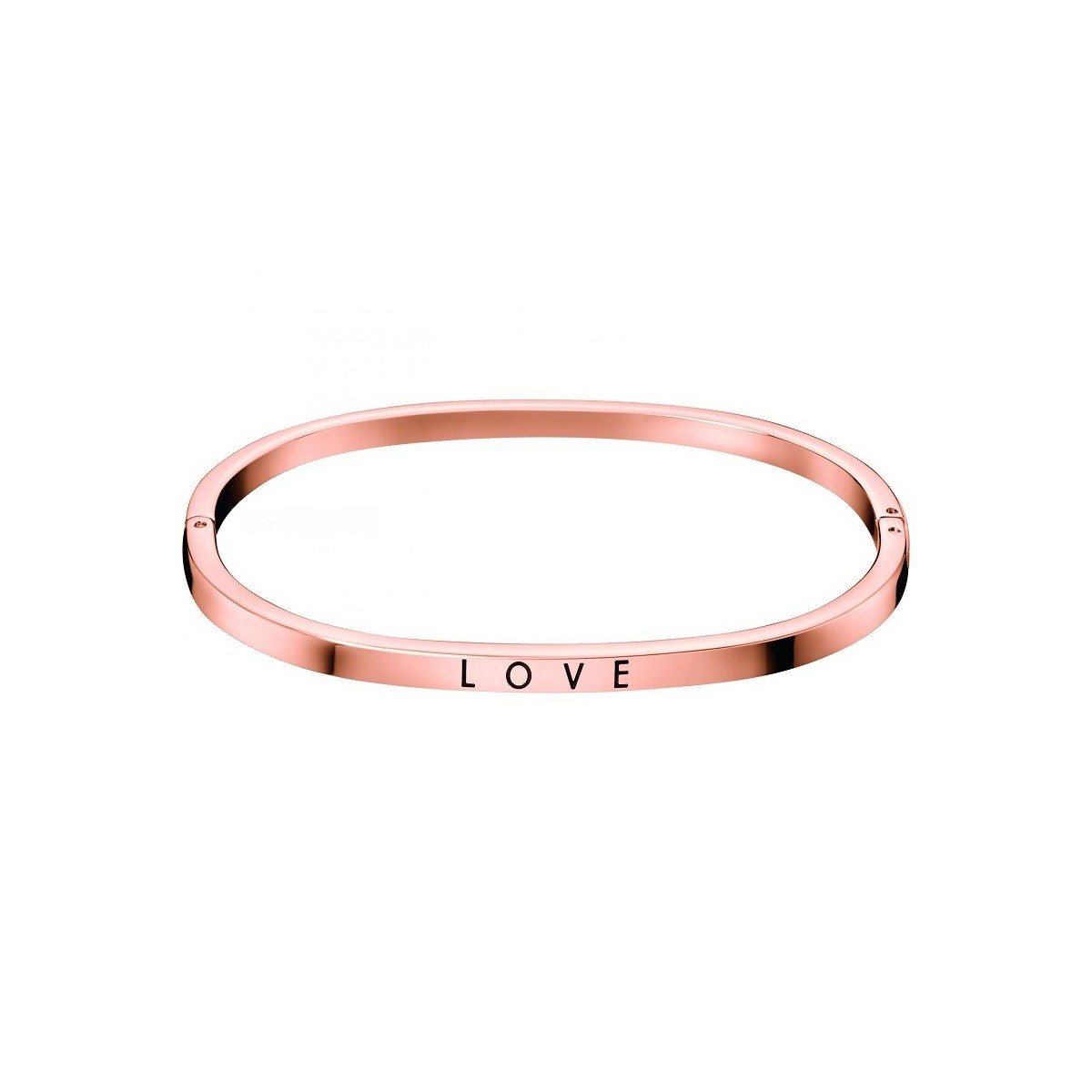 Steel bracelet Calvin Klein rigid squared gold rosé plated and engraved Love; lateral snap closure, autumn winter new collection