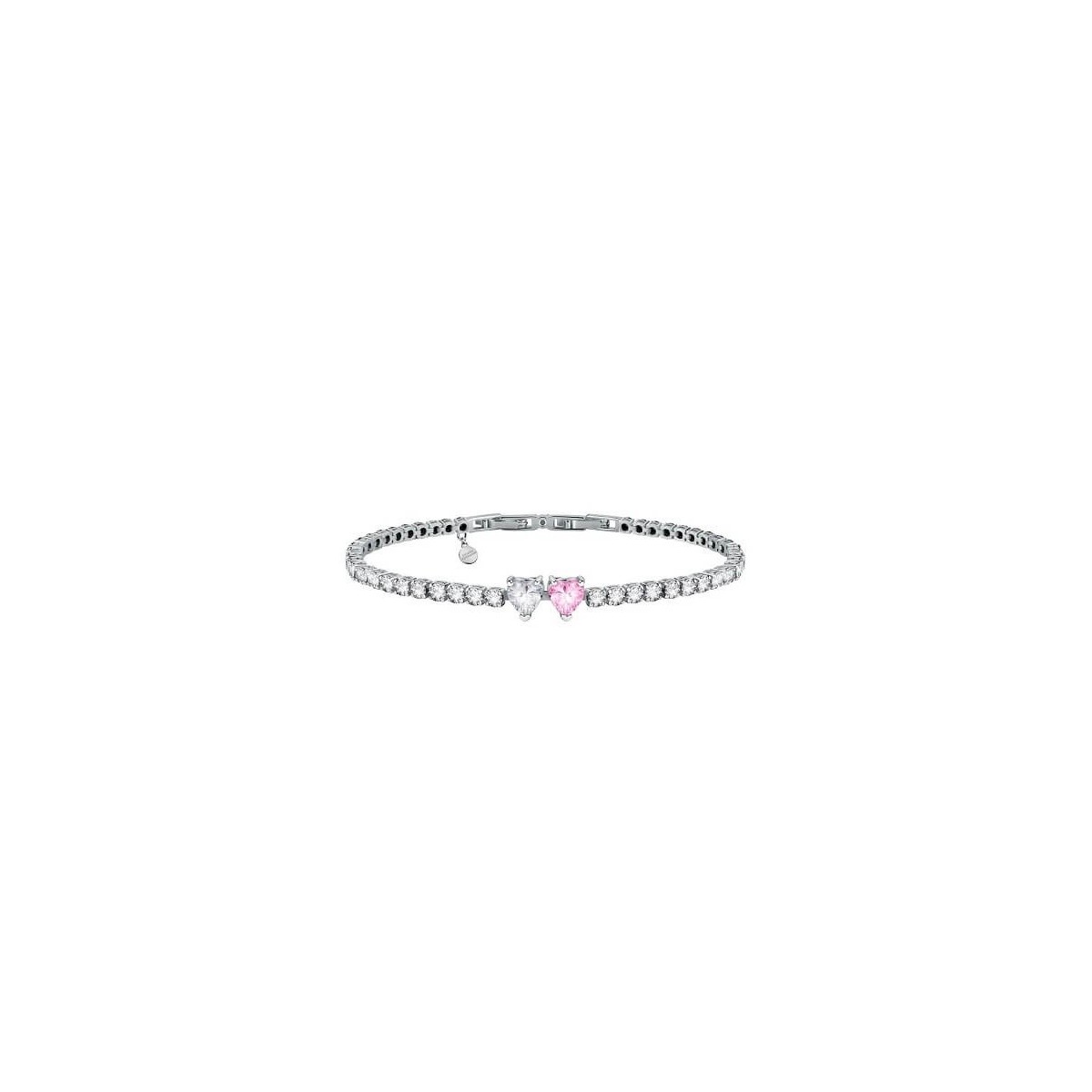 Tennis bracelet from the First Love collection in white zircons with two central hearts, one pink and one white