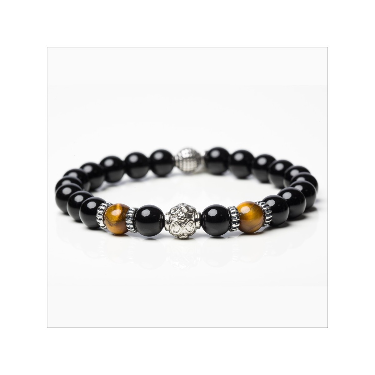 Elastic bracelet made of 8mm Onice stones and tiger eye and details made of 925 silver and metal.