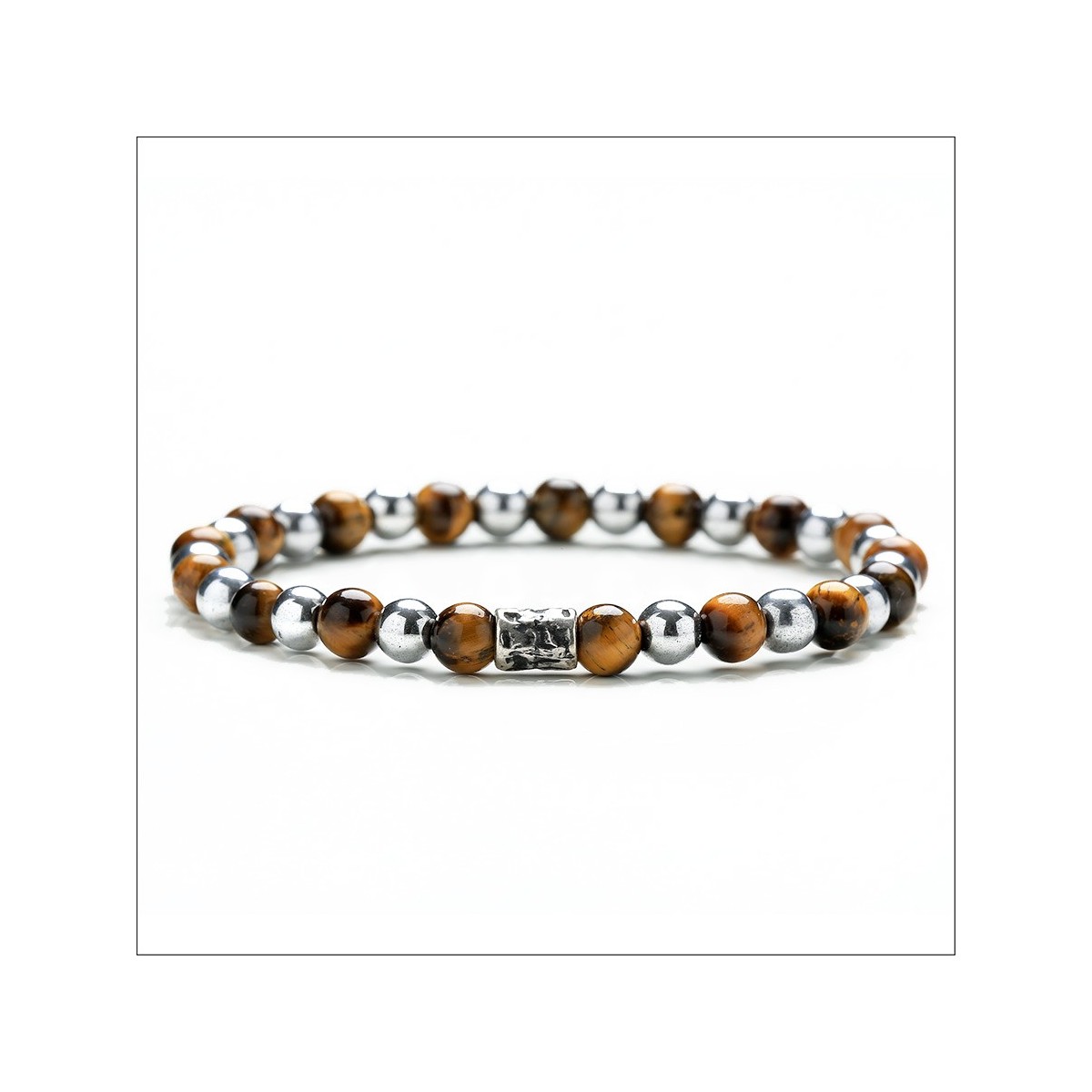 Handmade Elastic Bracelet with Tiger Eye and Hematite stones and details made of 925 silver.