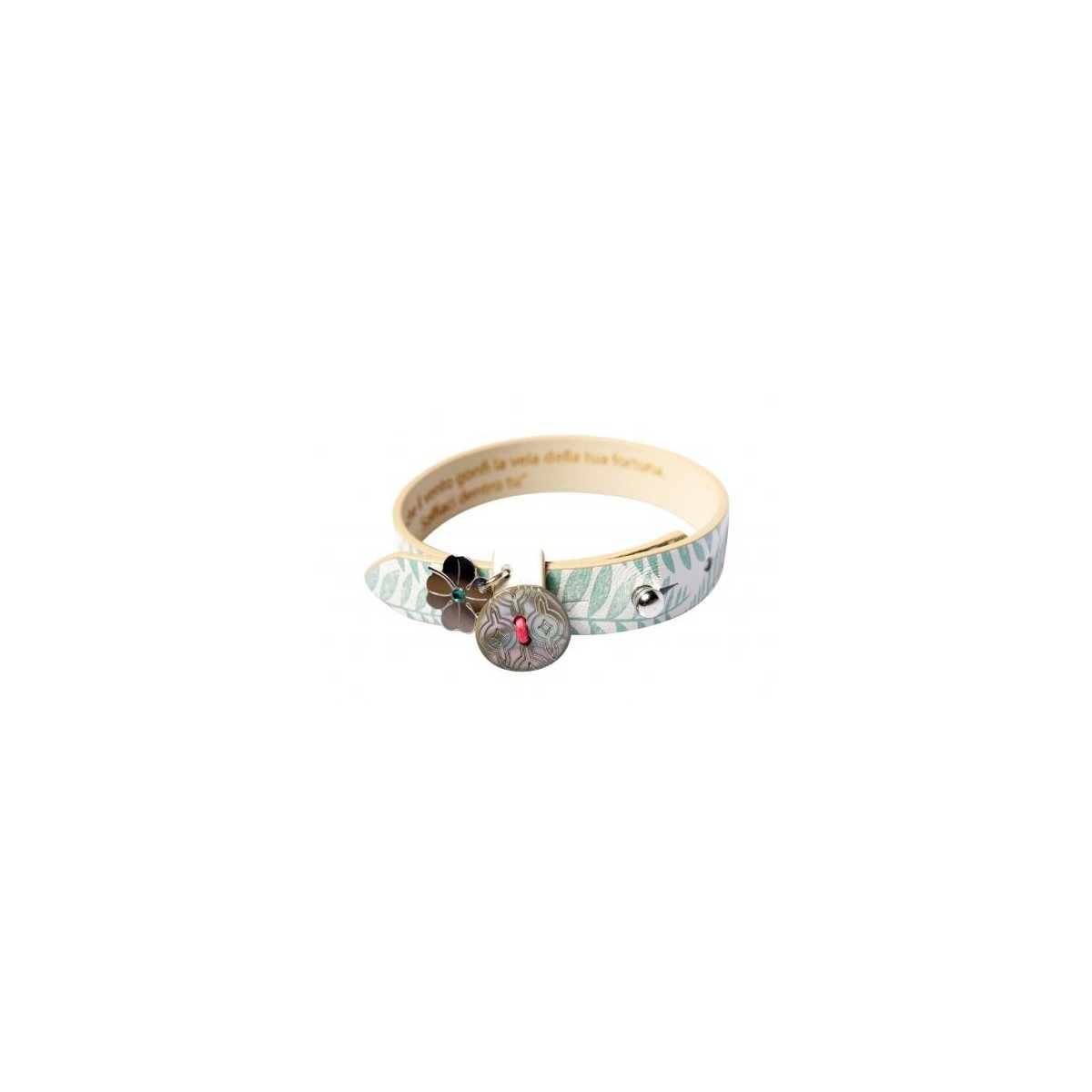 Men's/women's genuine leather bracelet stamped pattern with the Green, silver charms 925 and adding Swarovski points of light, and mother of Pearl shell buttons. It is customizable with a phrase that best represents you (max 50 characters)