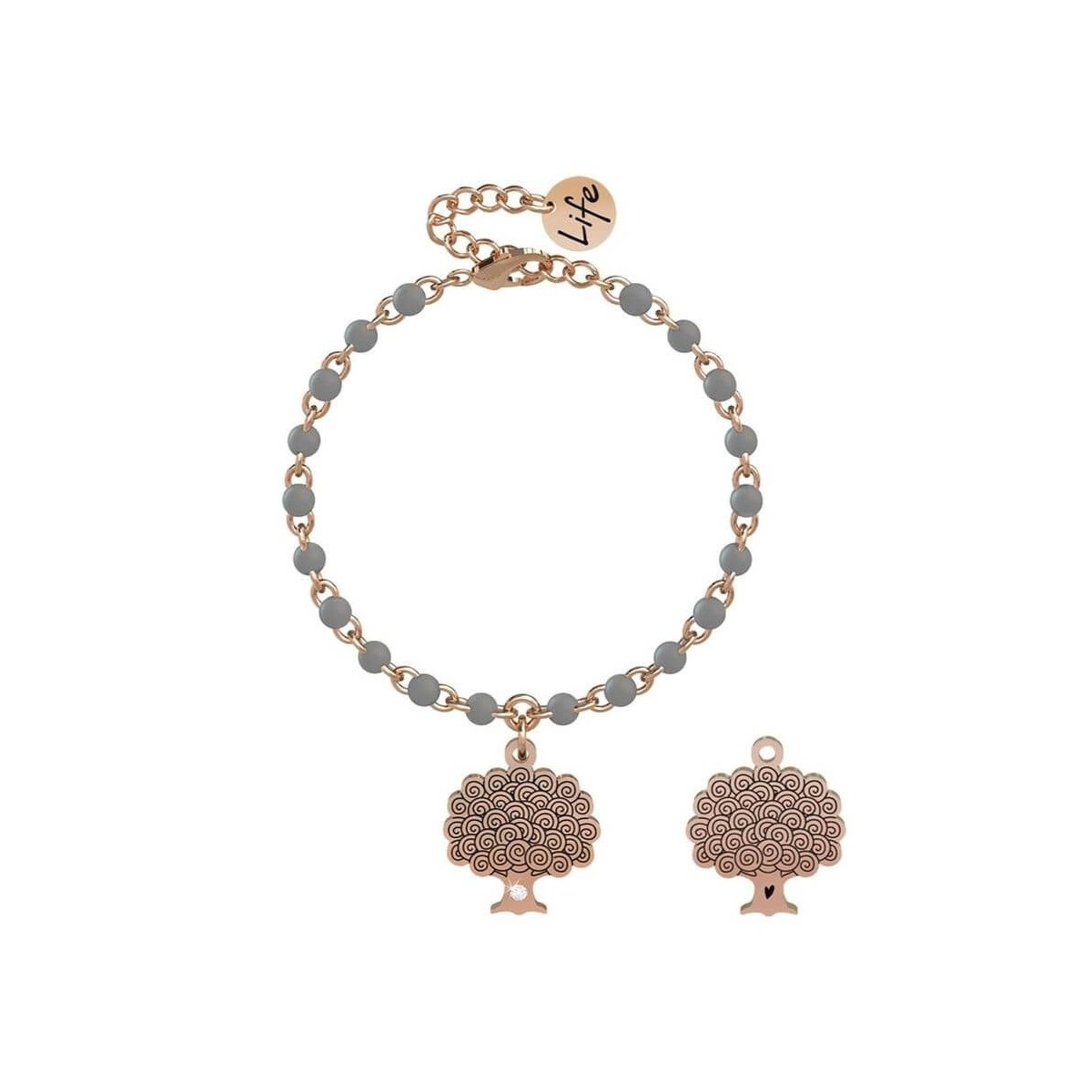 Rose gold-colored steel bracelet with tree pendant and rolo chain with gray enamel inserts