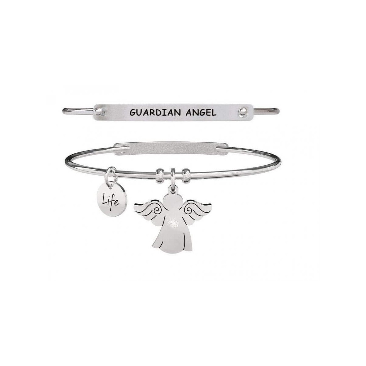 Steel bangle with angel pendant.