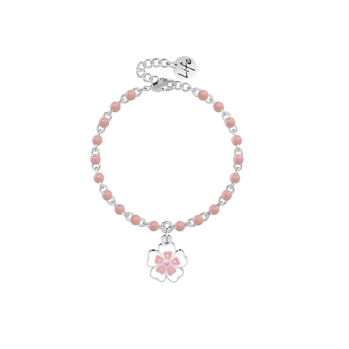 Steel bracelet with enamelled cherry blossom pendant and rolo chain with pink enamel inserts.