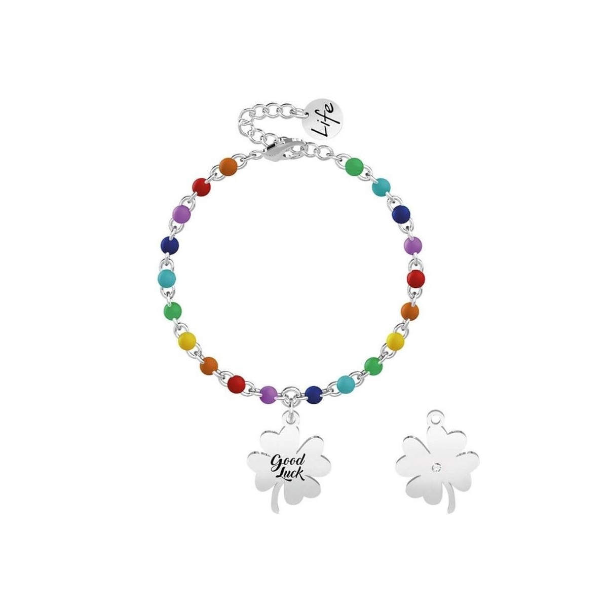 Steel bracelet with four-leaf clover pendant and rolo chain with multicolor enamel inserts.