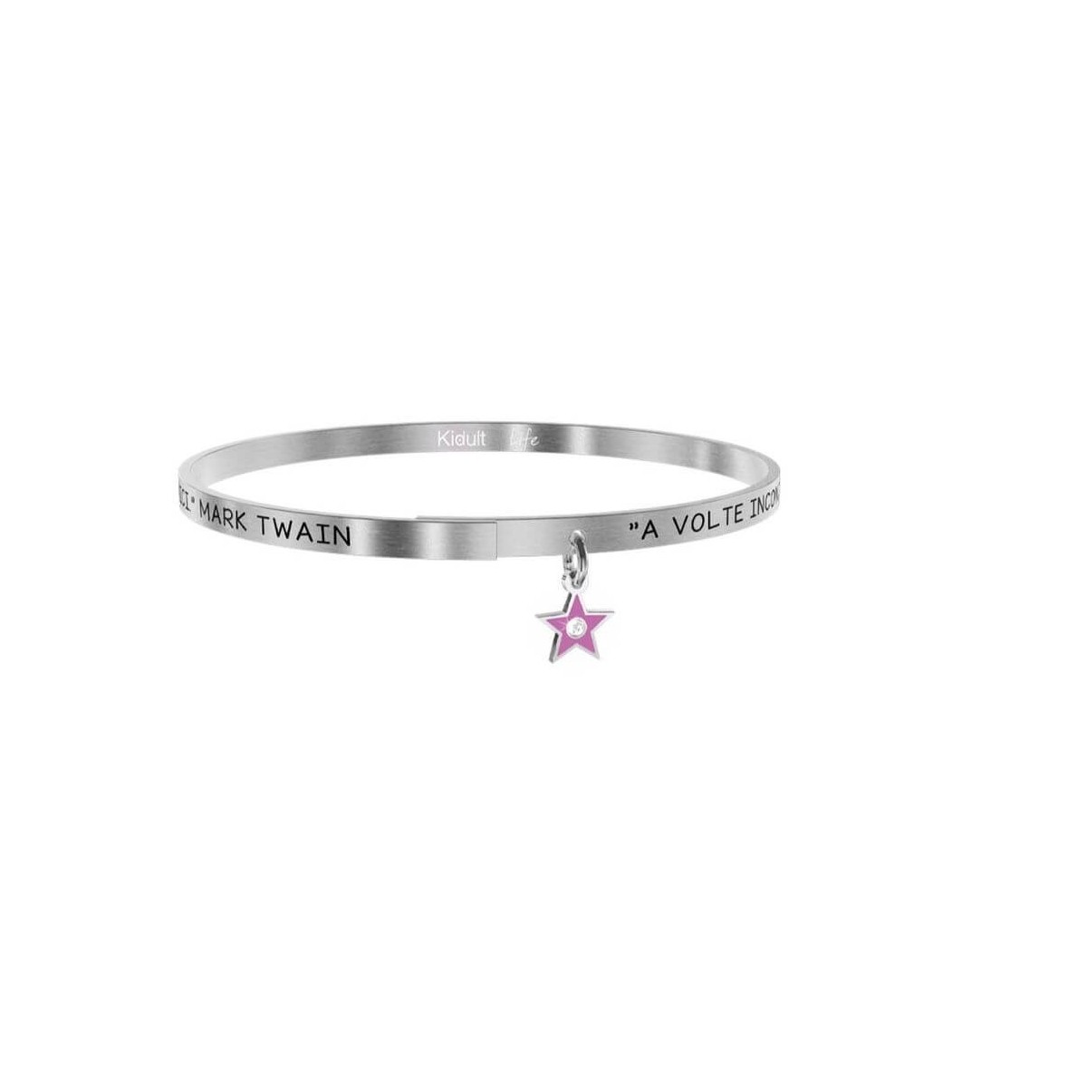 Thin bangle in brushed steel with writing and small lilac enameled star pendant.