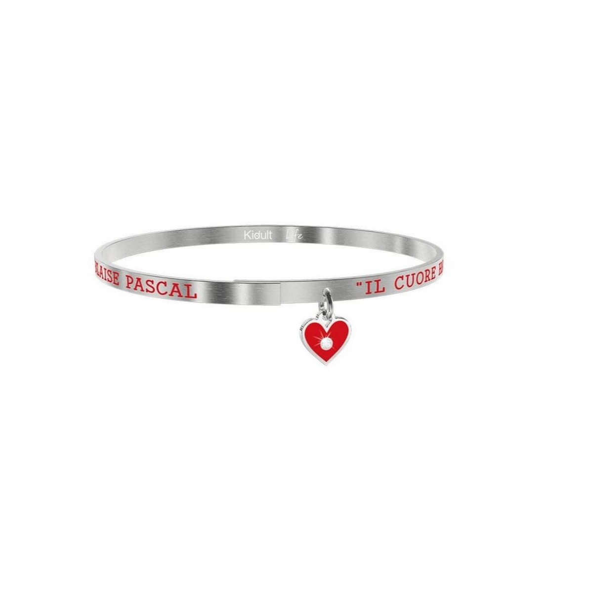 Thin bangle in brushed steel with writing and small red enamel heart pendant.