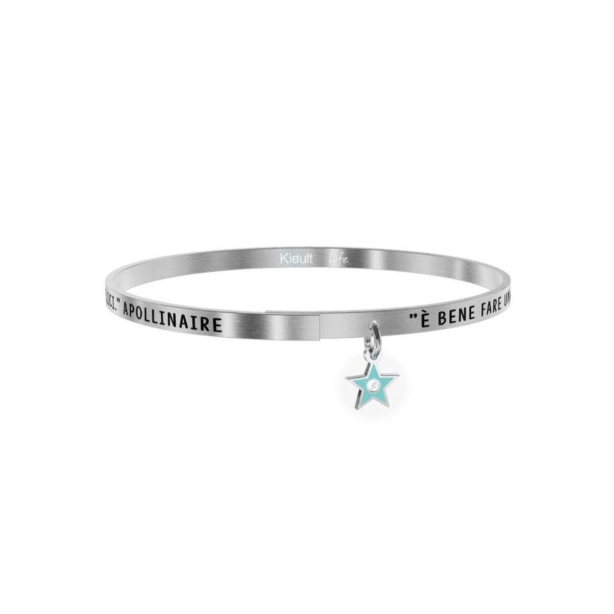 Thin bangle in brushed steel with writing and small blue enamelled star pendant.