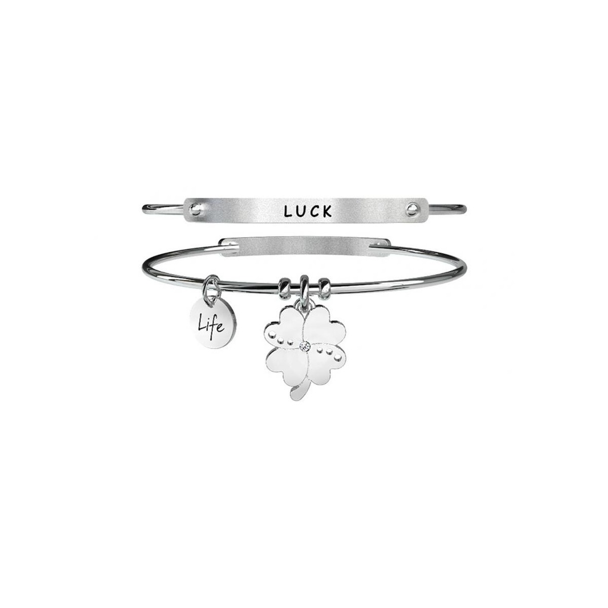 Rhodium-plated rigid steel bracelet with four-leaf pendant and light points. Wishing you good luck