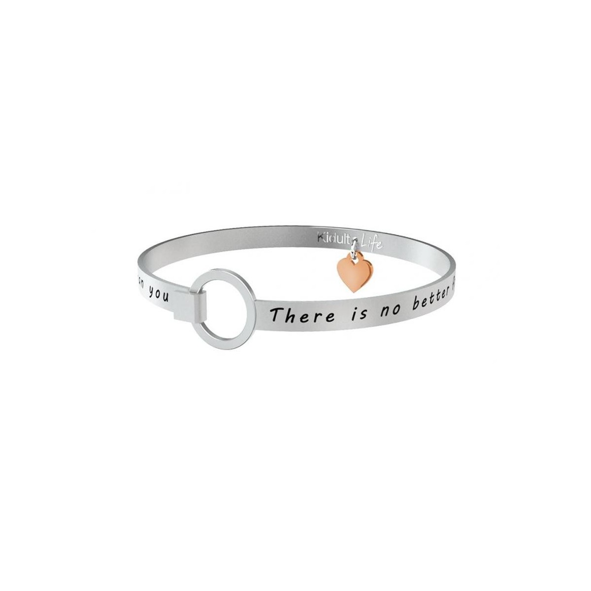 Sturdy steel bracelet bangle bracelet with pink gold plated heart pendant and engraved phrase; openable