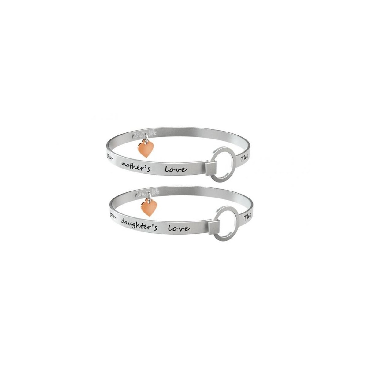 Brushed steel bracelet pattern with engraved engraved phrase and pink gold plated heart pendant, available in couple mom and daughter