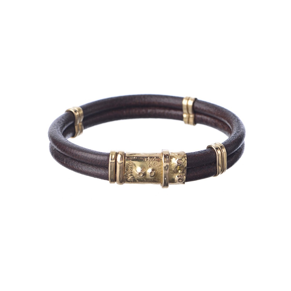 Men's bracelet Grand Tour collection with double-stranded Tuscan leather cord 5 mm, retractable closure and 18 kt gold-plated elements.