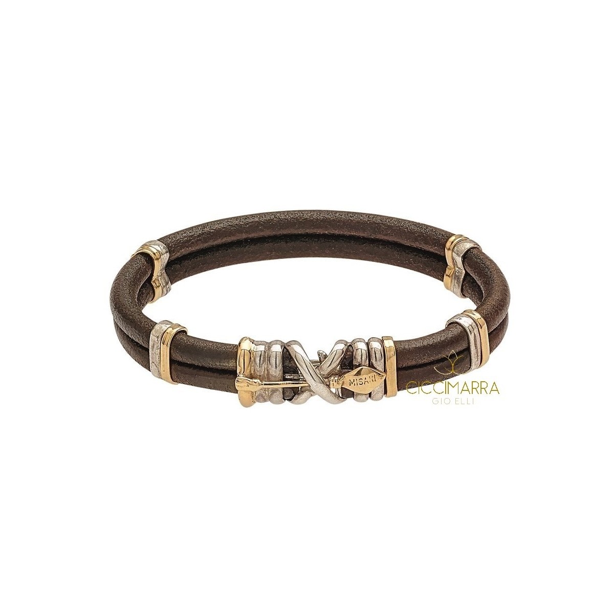 Man Grand Tour collection bracelet with double 5 mm Tuscan leather thread, with 18 kt gold and 925 silver elements, foldaway closure with arrow.