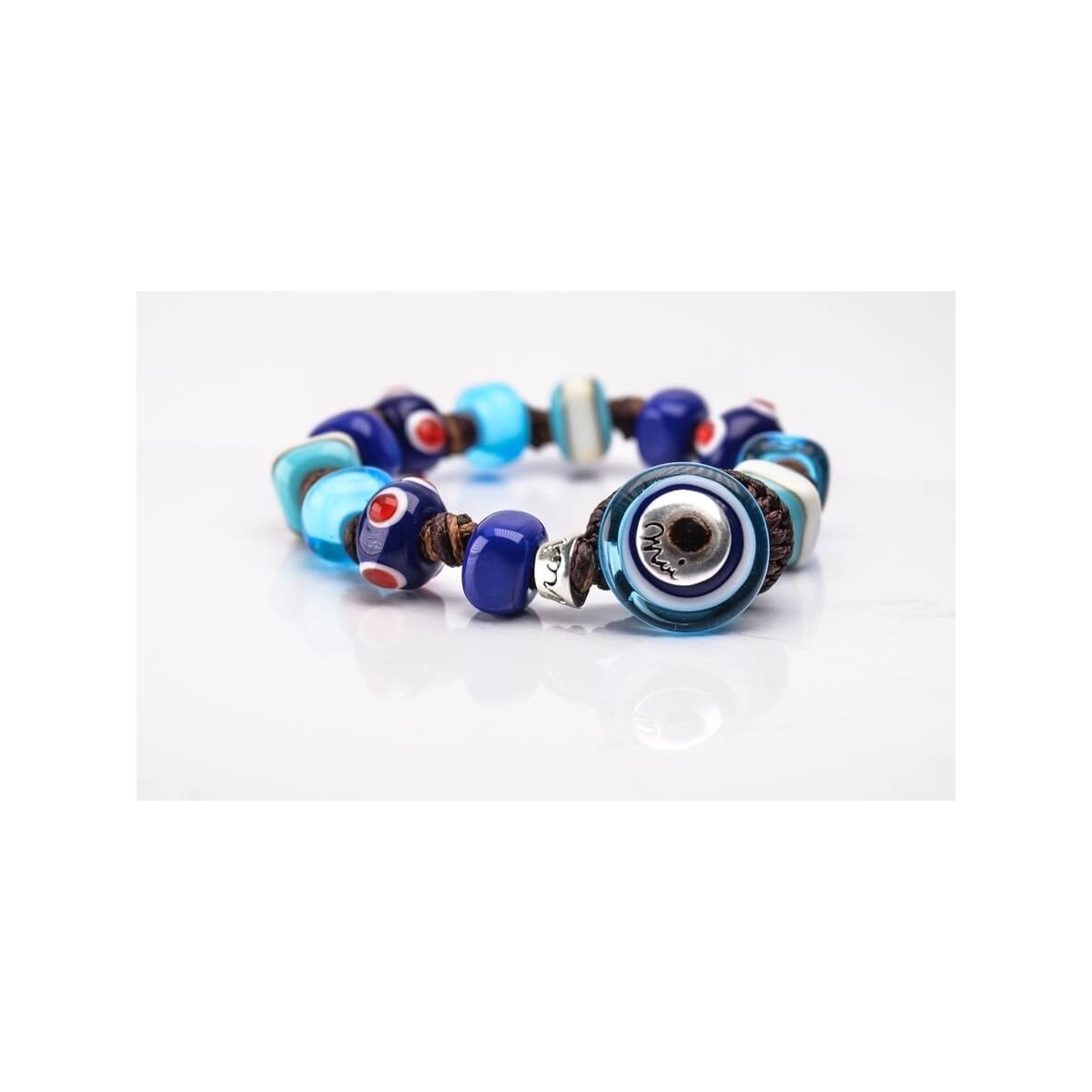 Original Moi men's and women's bracelet with fabric cord and Murano glass beads in shades of blue and red dots, designer Franco Cannarile - Paguro