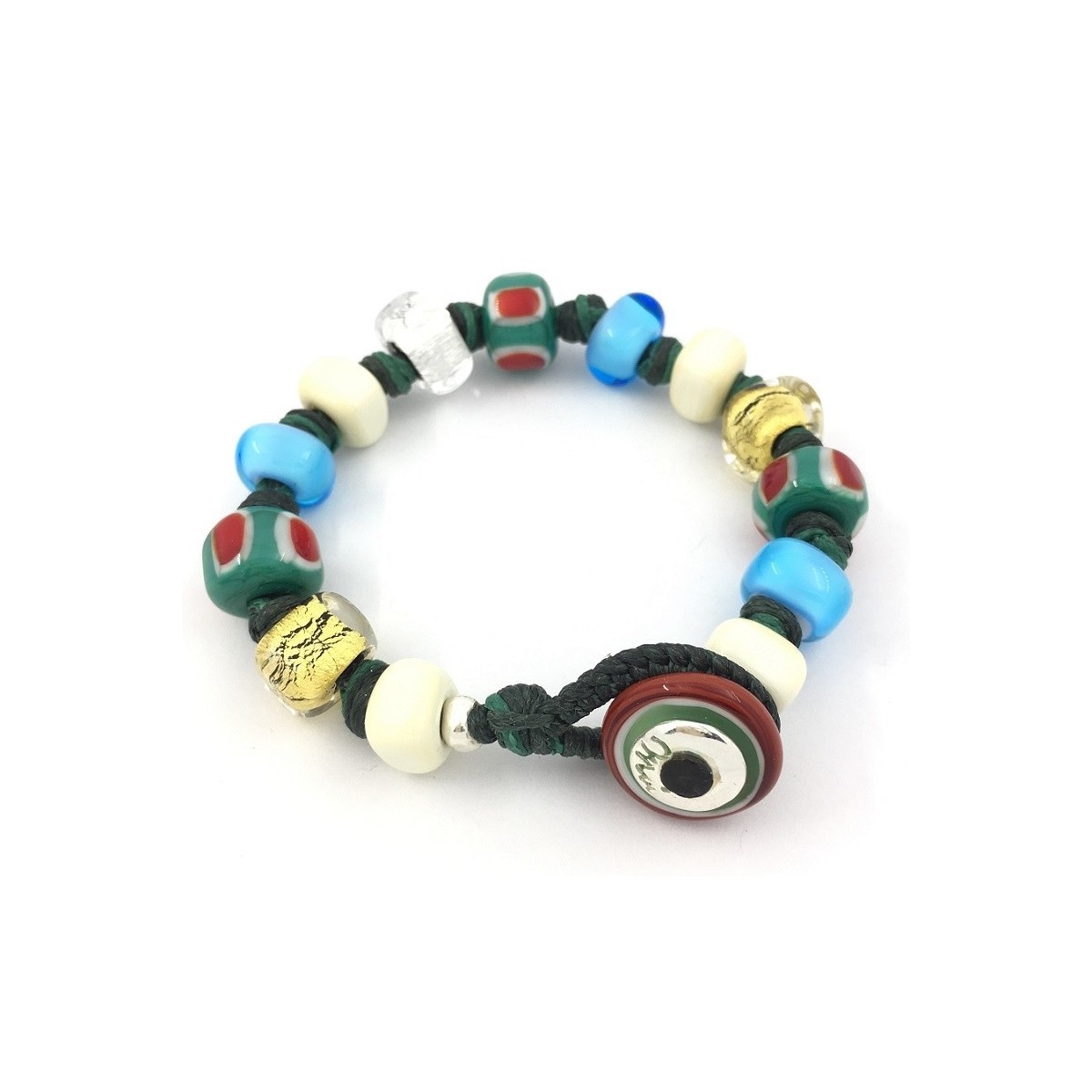 Handcrafted creation of the glass artist Franco Cannarile. Original Moi bracelet. All the nuances and the thousand facets of the colors of nature captured in the glass of the bracelets Moi pearls. Unique bracelet composed of glass with a gold leaf inside, a glass with a white gold leaf inside, glasses in cream, light blue and green with red and white rectangle motifs. The rope string is bottle-green.