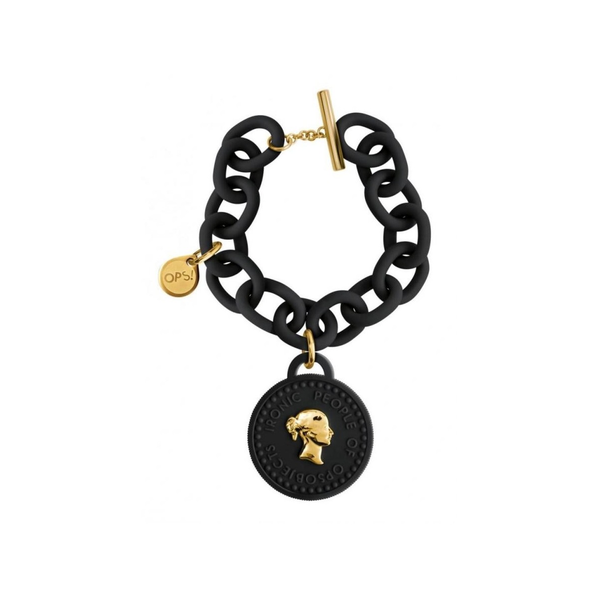 OPSOBJECTS launches a brand new bracelet that takes inspiration from "unforgettable eighties", with the sexy and glamorous trend of charms in the shape of coins. Double variation, one or five charms, expressed in 10 shades, making it the must-have accessory this spring summer, able to embellish dresses and pleated skirts fluids as more rock tones outfits made of leather and suede. All coins are perfumed and has a double face style: on the one hand the unmistakable loghetto "oops!", the other an ironic woman's face, both in silver lacquered gold & polycarbonate. The XL chain, presents 15 oval mesh, the famous label "OPS" and the closing "T" bar silver steel & gold.
