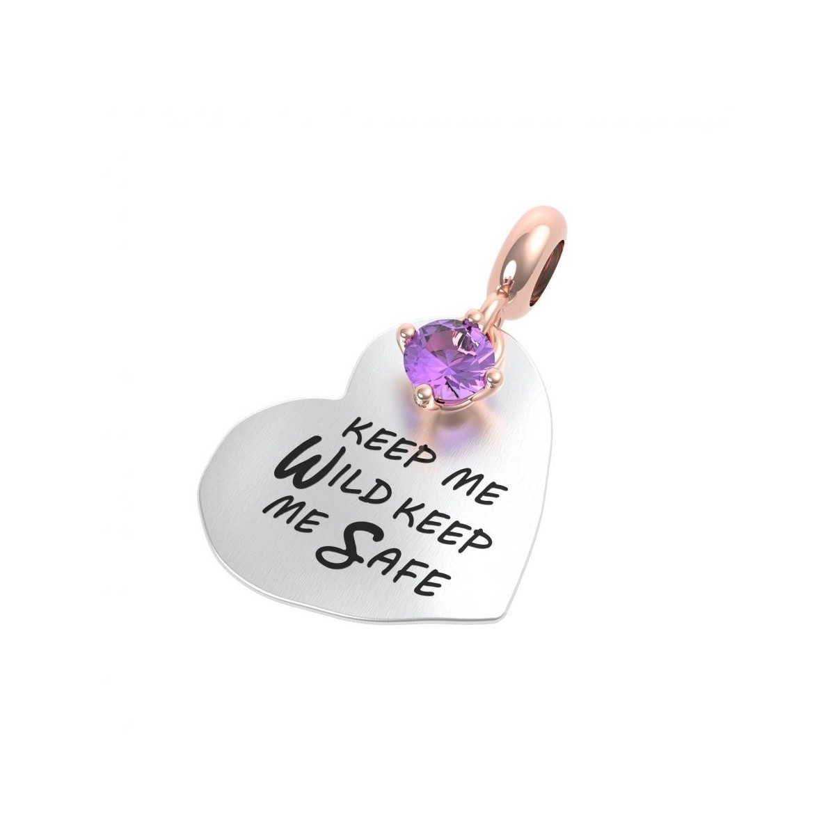 This pendant recalls the shape of a heart in 925 silver with a rose gold plated ring and a small amethyst gem, compatible for a modular bracelet or necklace, friendship collection