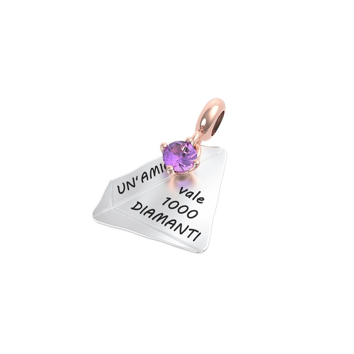 Whoever finds a friend finds a treasure; 925 silver diamond-shaped pendant with rose gold plated ring, compatible for bracelet or necklace, Rerum Gioielli collection