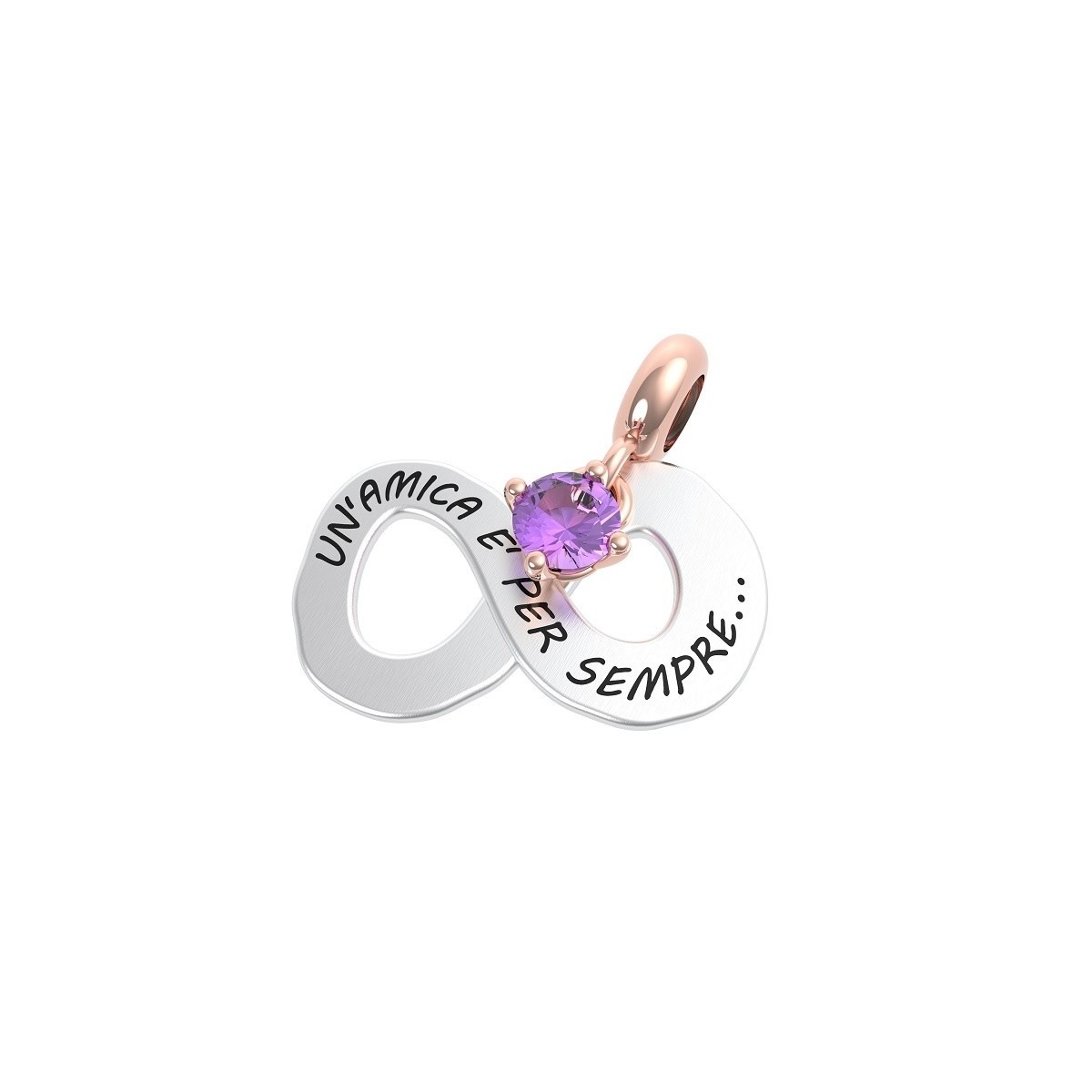 A friend is forever; infinity-shaped pendant in 925 silver with rose gold plated ring, compatible for bracelet or necklace, Rerum Gioielli collection
