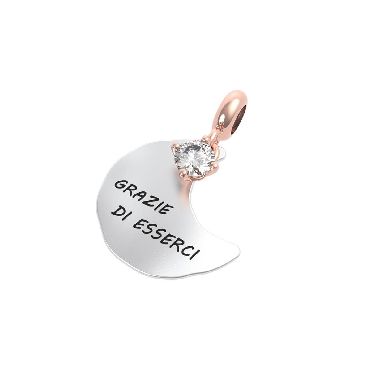 you and me on a cloud; moon-shaped pendant in 925 silver with rose gold plated ring, compatible for bracelet or necklace, Rerum Gioielli collection