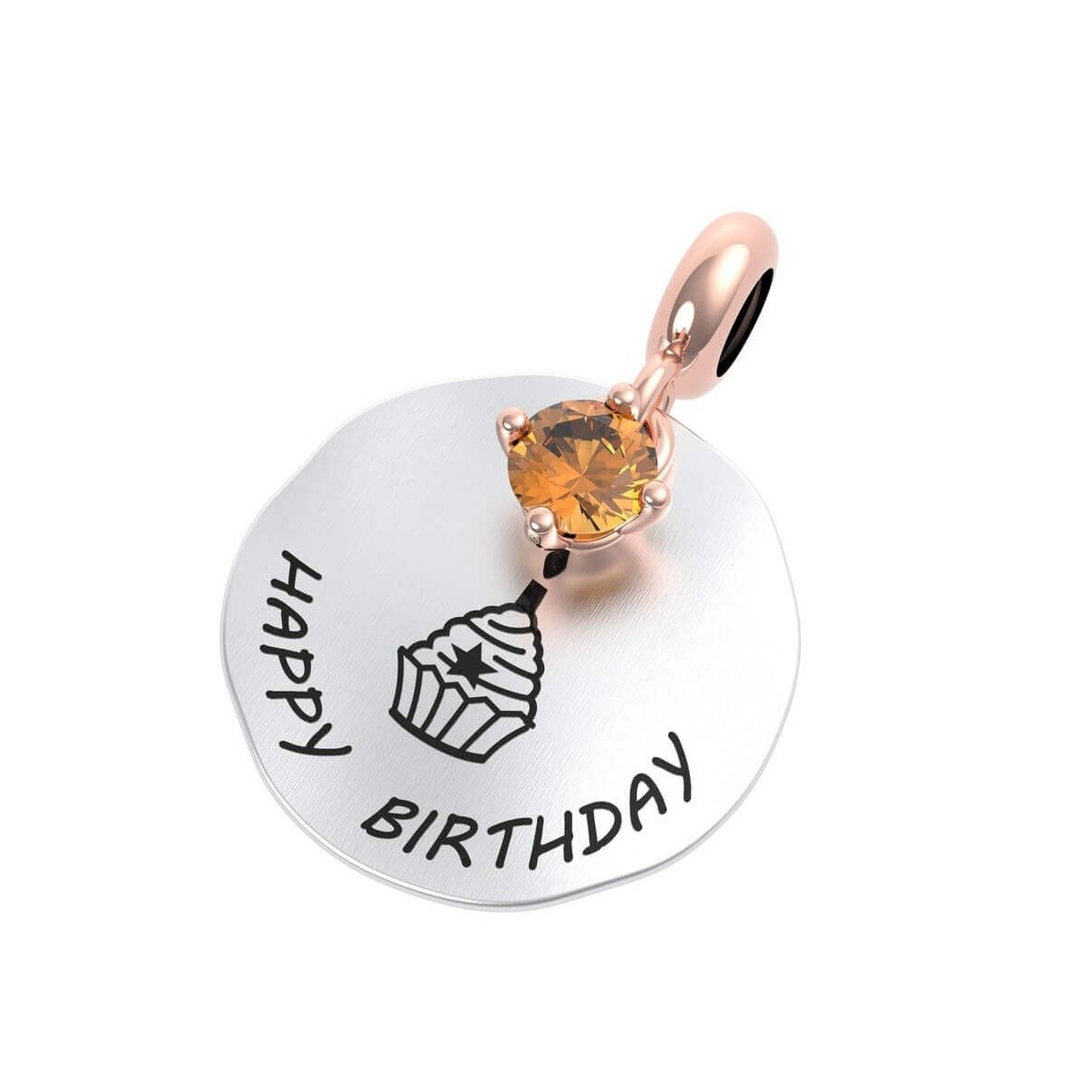 Happy birthday; coin-shaped pendant in 925 silver with rose gold plated ring, compatible for bracelet or necklace, Rerum Gioielli collection