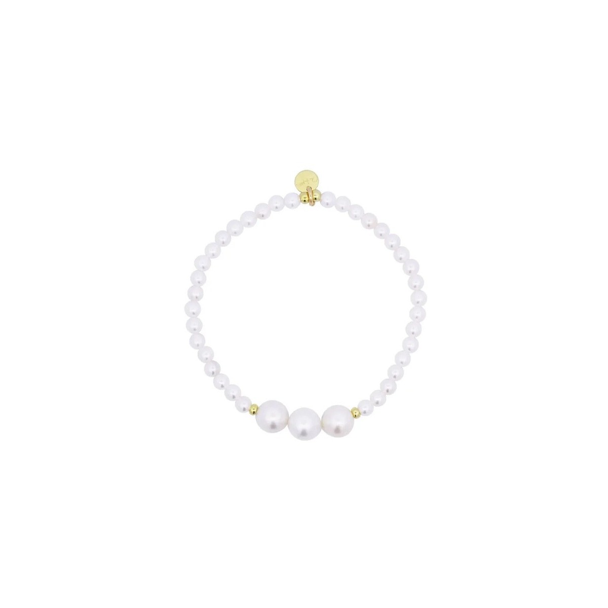 Elastic pearl bracelet with golden 925 silver elements with three larger central pearls.