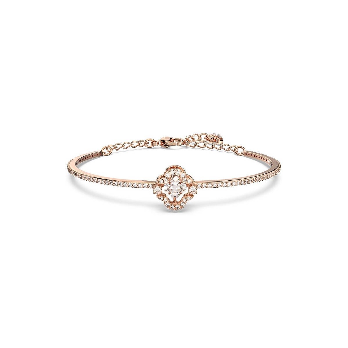 Swarovski women's rigid bracelet, from the Sparkling collection made in an elegant rose gold plated frame embellished with white crystals and central motif with white four-leaf clover surrounded by crystal pavè.