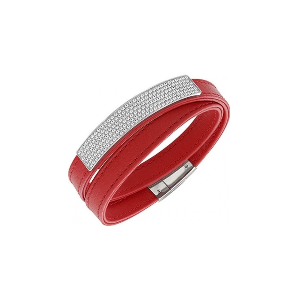 This red leather Vio bracelet offers a chic hint of marine style for summer. It features a stainless steel plaque embellished with clear crystal pavé. The sleek and refined magnetic closure is very easy to use. Perfect for stacking with other bracelets and bangles!