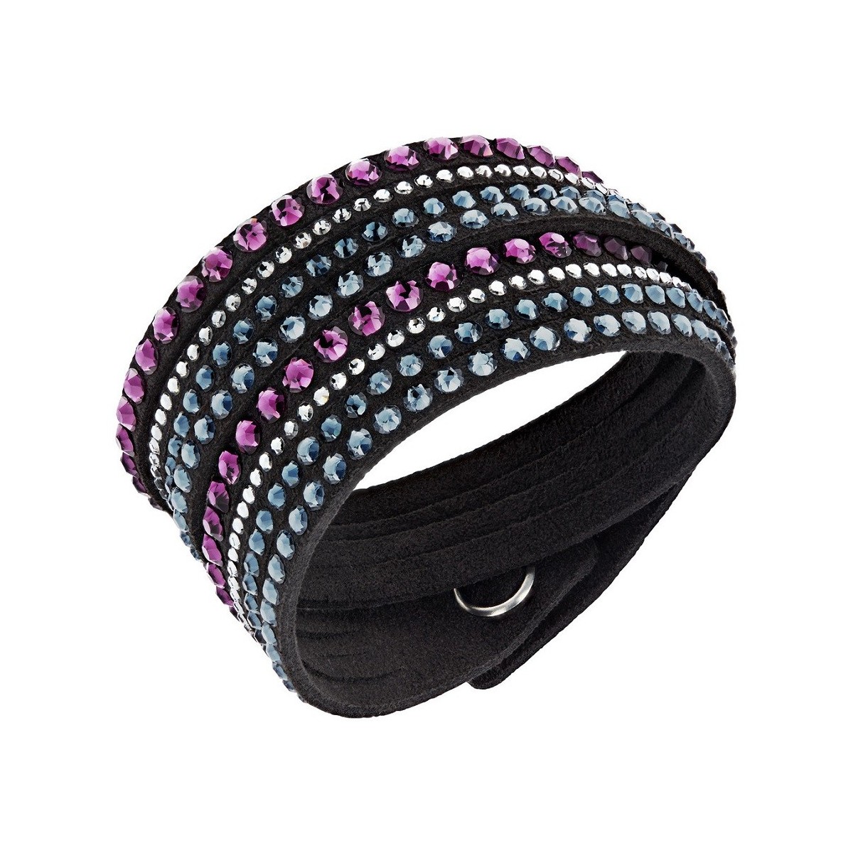 Swarovski’s iconic Slake embellished with stunning pink, blue, and clear crystals. This black Alcantara® bracelet winds comfortably around your wrist for an edgy look. The closure consists of two clear crystal buttons, allowing you to adjust the size (36/38 cm).