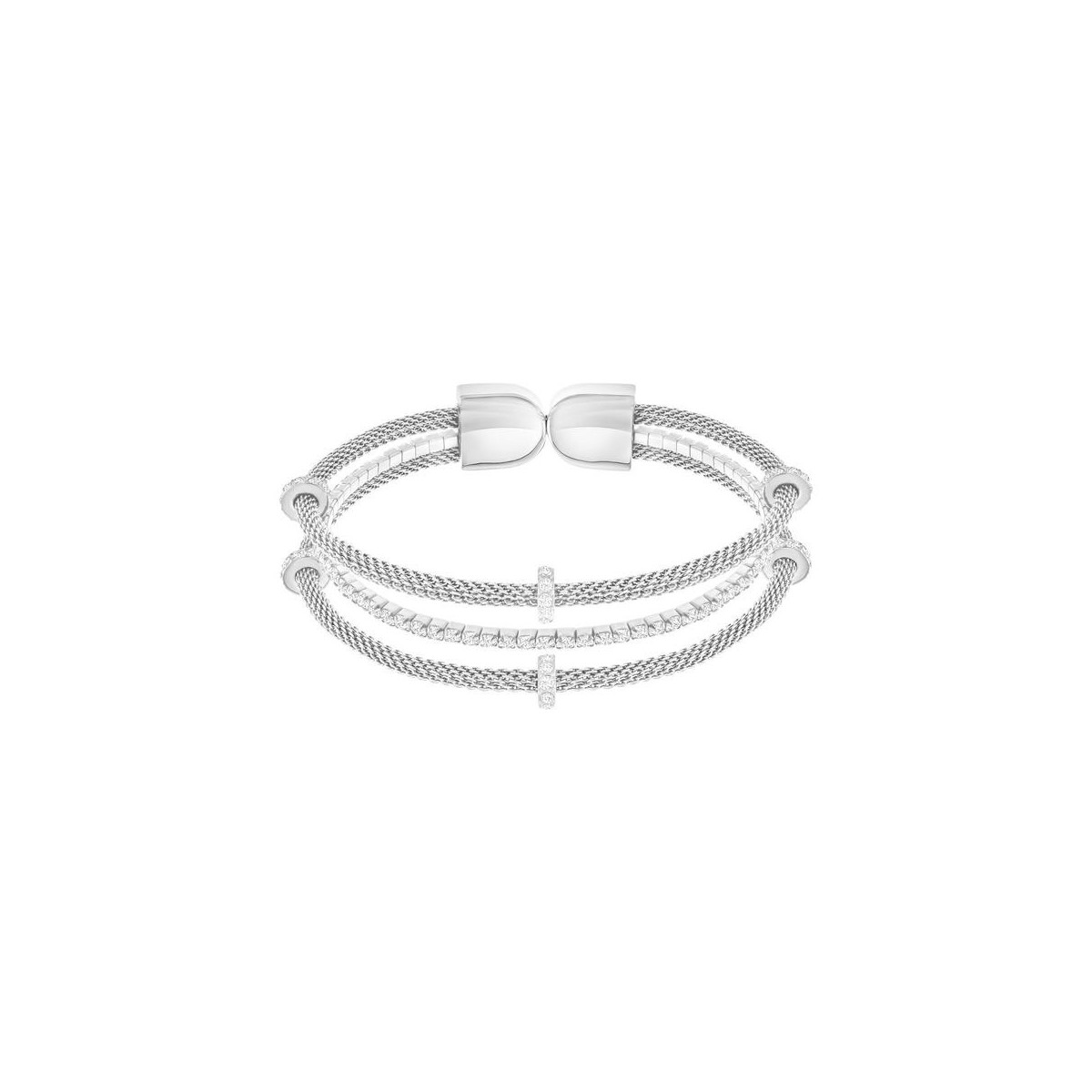 The bangle has a layered profile tic-tac-toe of thin bracelets, and Clear Crystal pavé alternates and steel mesh. A proposal for a trendy contemporary architecture jewel definitely current. Match it with other bangle to interpret the style.
