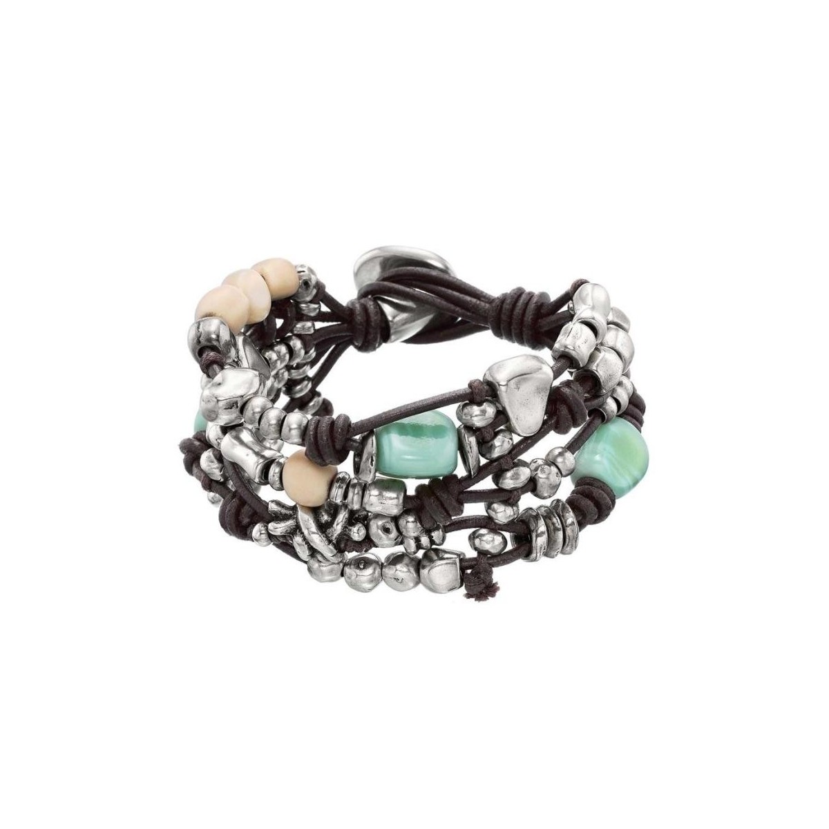 Wide bracelet made up of various strands of brown leather and beads insterpsersed with turquoise crystal and resins - PUL1280TQSMTL0M