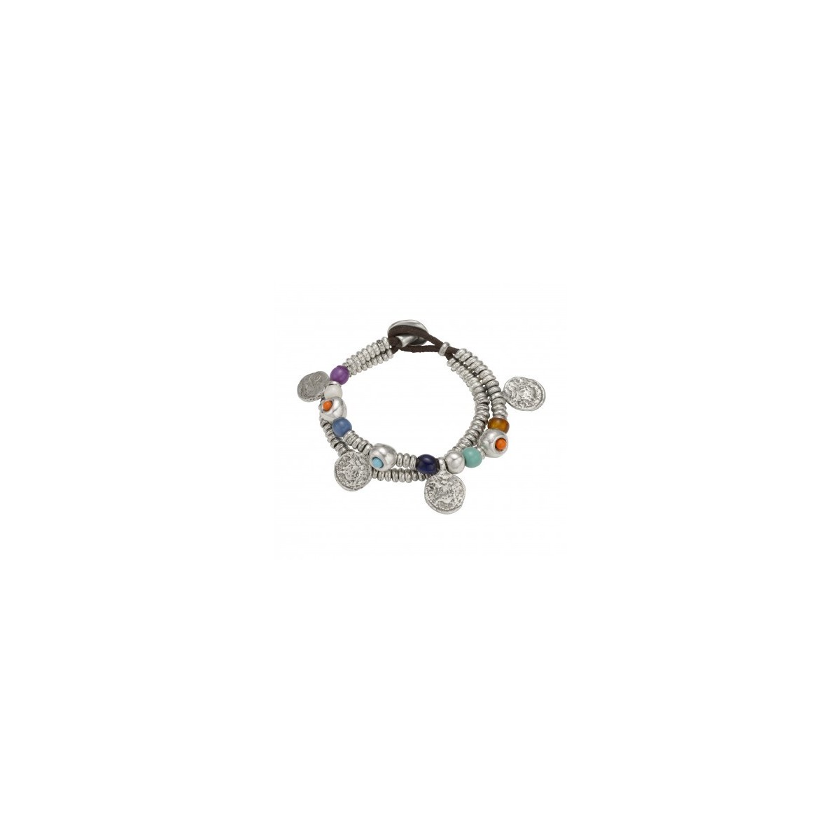 Leather cord bracelet made of two completely covered by metal rings and silver plated nuggets, and colored resin stones.