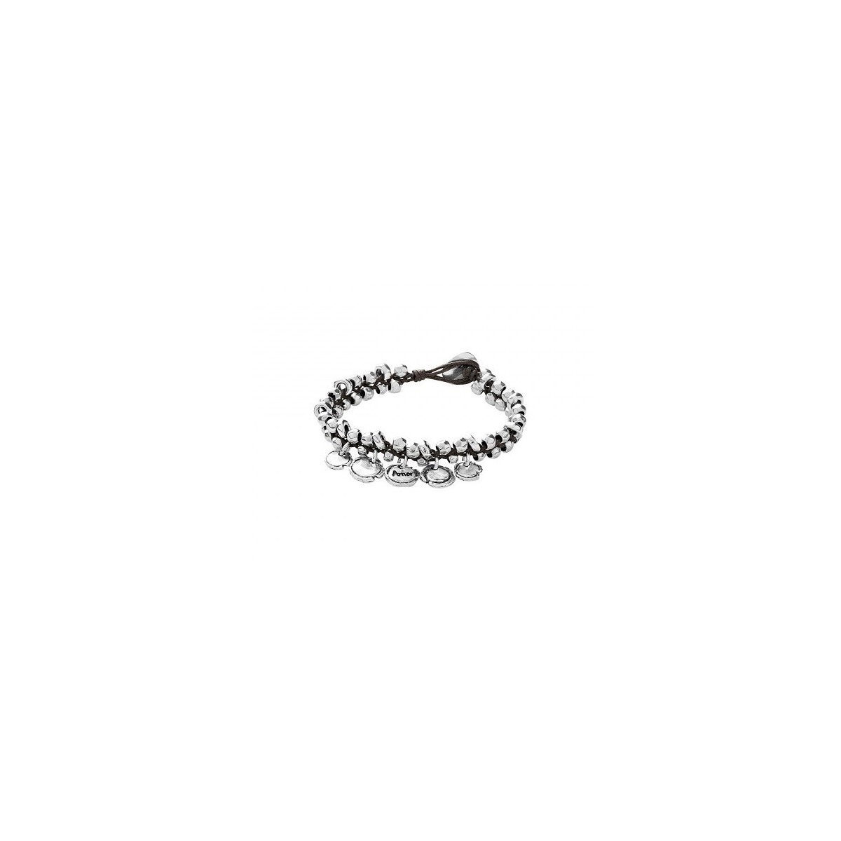 Amor bracelet in leather and silver plated metal with nuggets and pendants; Closes engraved logo, measures about 19cm
