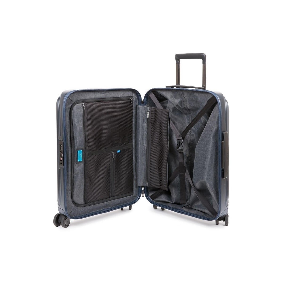 PIQUADRO 4-wheel ultra-slim rigid cabin trolley with USB A, micro-USB and type-C plate, power bank, CONNEQU from the PiQ Biz collection in embossed blue polycarbonate.