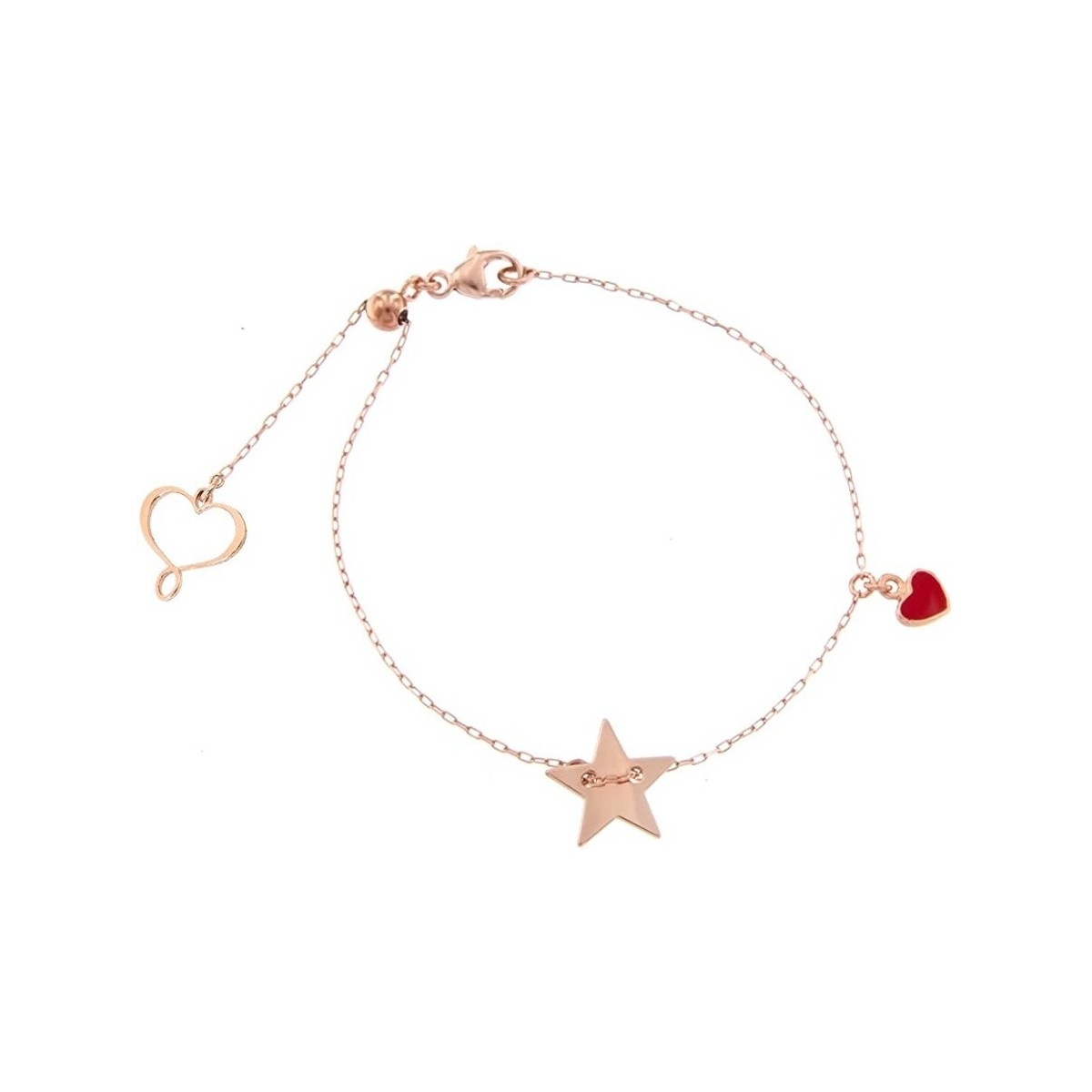 Maman et Sophie women's bracelet from the Luce collection. Made of high thickness and high strength 925 silver plated in a delicate rose gold. The bracelet features a small 7mm red enamel heart and a 10mm rose gold plate star. The length of the bracelet is adjustable thanks to a small sphere placed at the end up to a maximum of 19cm. Lobster clasp closure